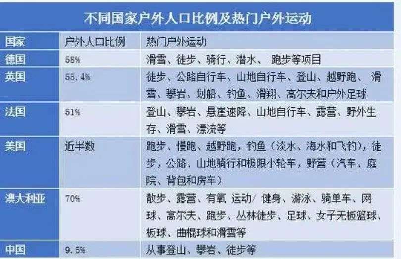 有调查数据显示,2014年我国约有1.3 亿人开展徒步旅行、休闲户外等泛户外运动,占总人口数的9.5%。占总人口数的4.38%。而在美国、英国、法国等发达国家,户外人口比重占50%以上,澳大利亚户外人口比重更是高达7成。