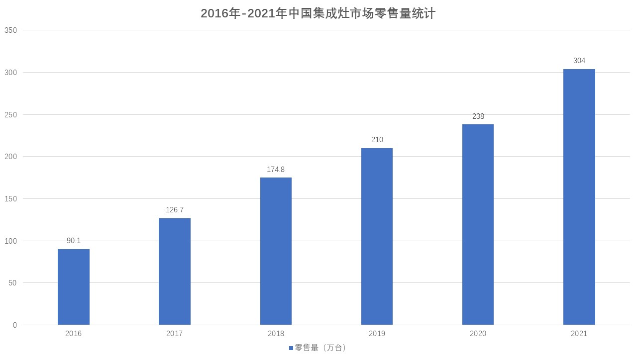 根据奥维云网数据显示,2021年集成灶零售市场规模达304万台,销售额256亿,零售量同比增长28%,零售额同比上涨41%。在此之前,集成灶已经保持高位增长近十年了。