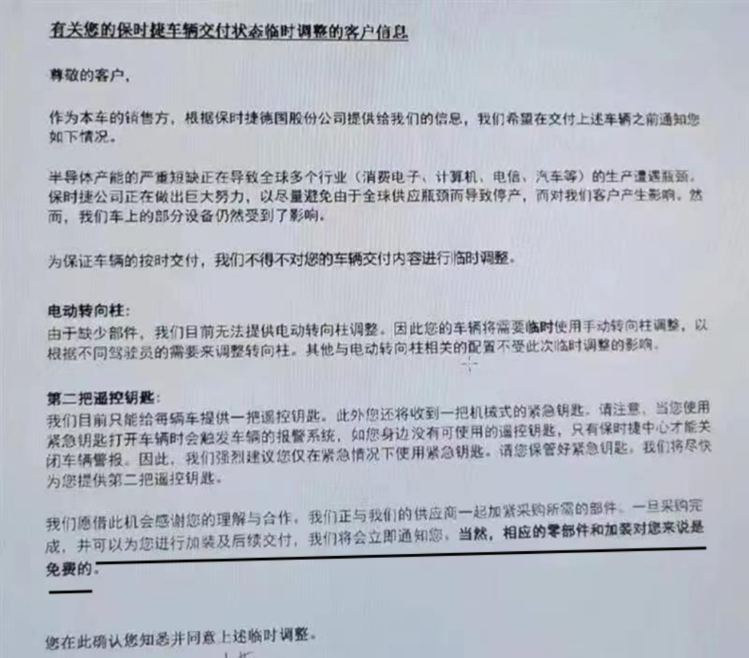 第二段,“尽管保时捷一直在积极应对,但很遗憾,依然受到严重影响。为了保证车辆及时交付……”(保时捷:那怎么办,不减配没法交车啊)