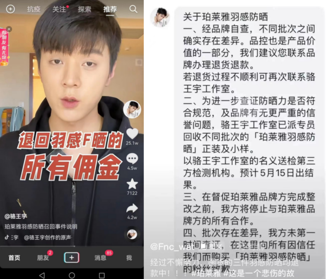 有趣的是,此次事件中,行动迅速,发布视频声明的骆王宇就成功从事件中脱身。“在督促珀莱雅品牌方完成整改之前,我方将停止与珀莱雅品牌方的所有合作。”声明中,骆王宇如此表示。并在评论区与品牌进一步互动,督促其给出解决方案,也安抚到了其广大粉丝。