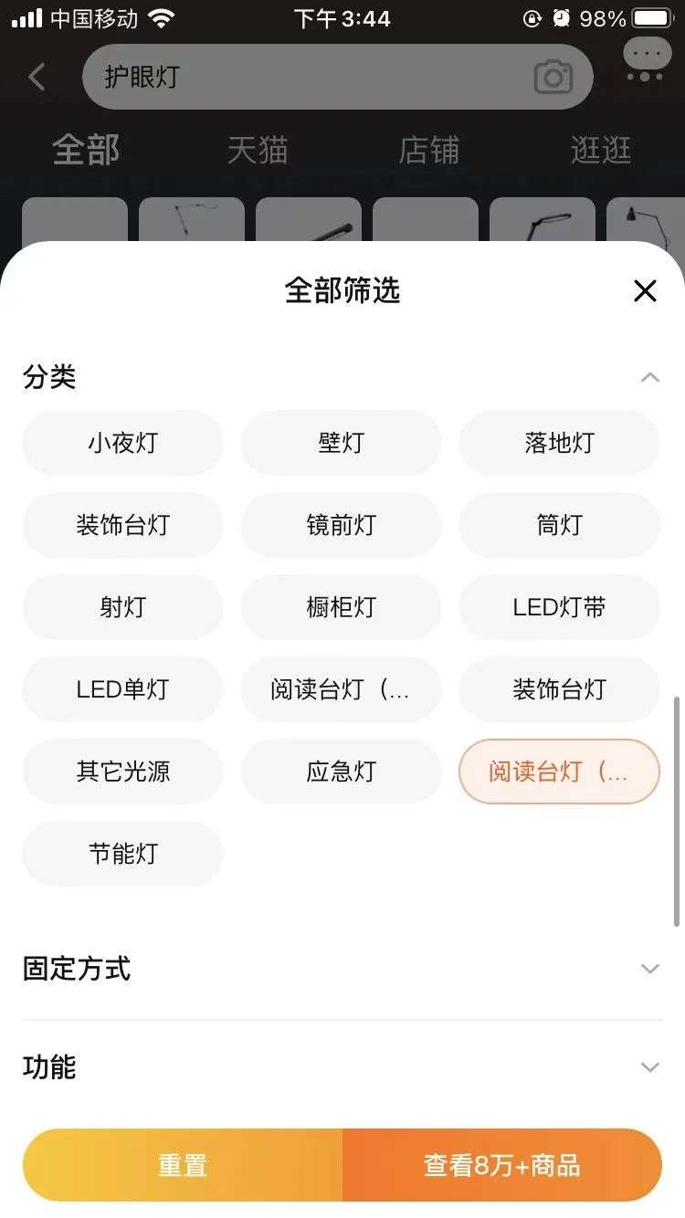 在淘宝搜索护眼灯,类别选阅读台灯,有8万多个商品丨手机截图