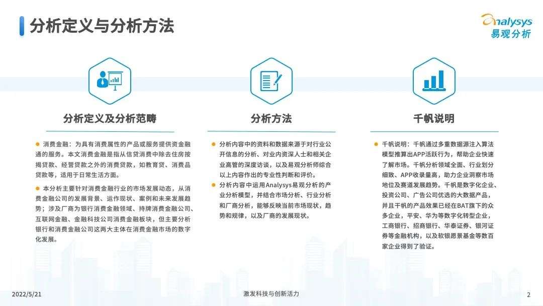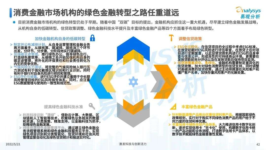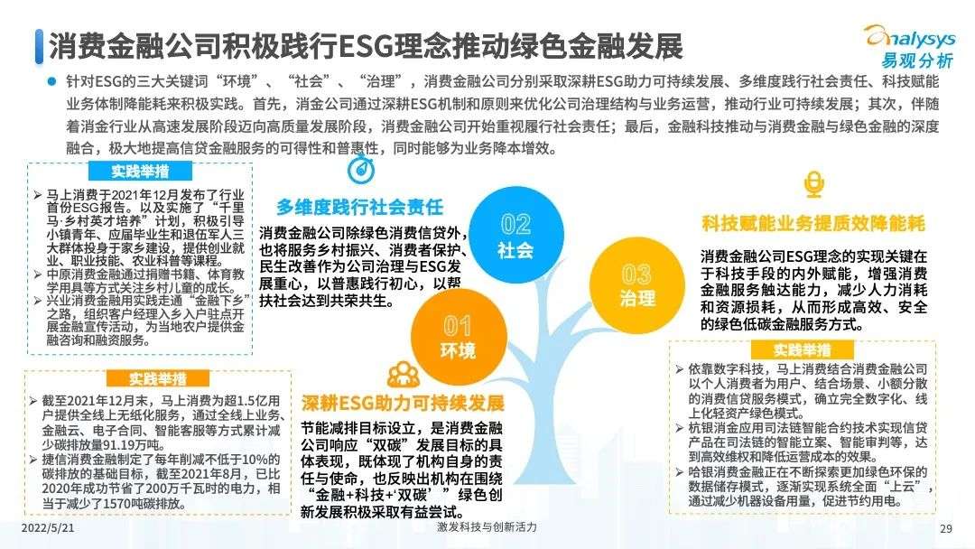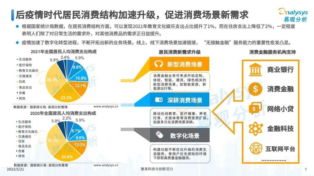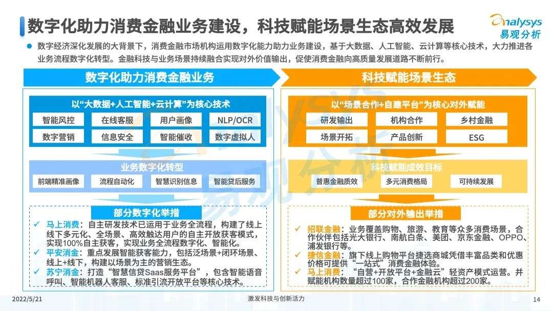 2022年初,国家发布《金融科技规划(2022-2025)》,企业数字化转型进展加快。回顾2021年,居民消费结构升级,线上化趋势突显,消费金融市场机构积极建设自身数字化业务能力。各家消费金融机构增加技术专利申请,银行机构加大科技投入,围绕自身各类科技实力建设已经逐步进行,并且加强绿色金融理念构建全面数字化业务场景。未来将进一步推进消费金融市场科技创新,提升赋能数字化进展。