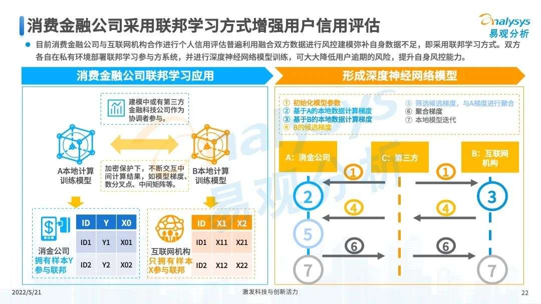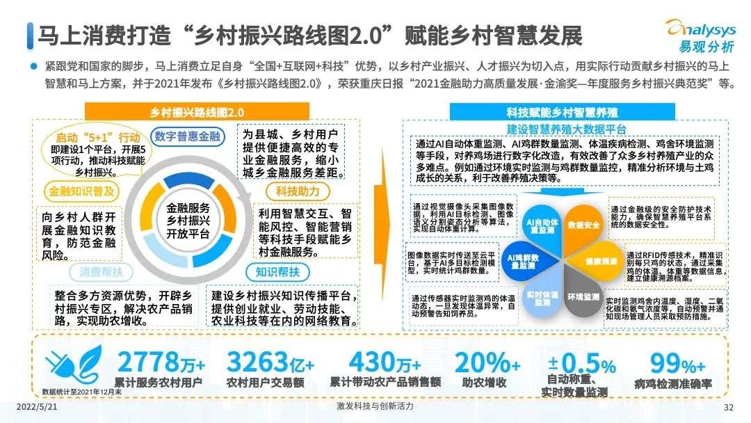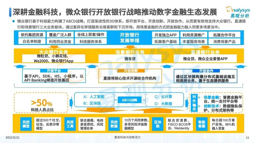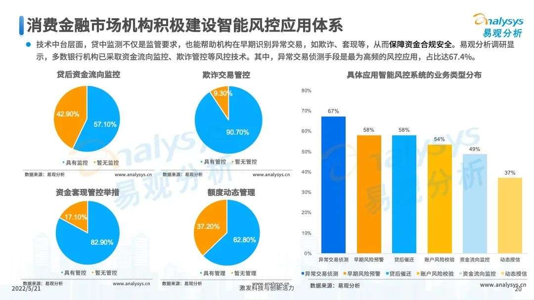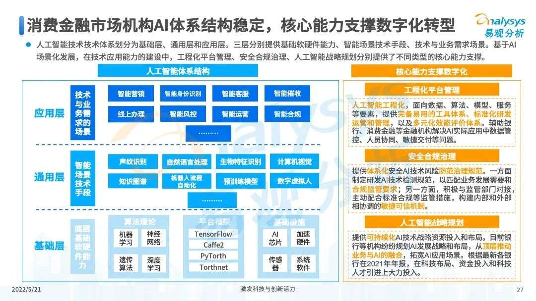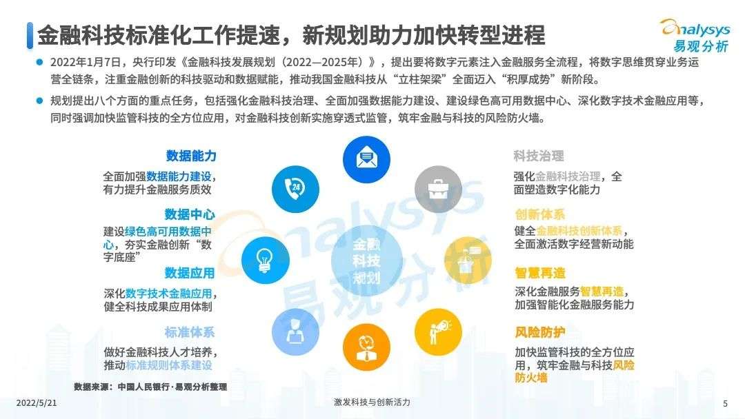 2022年初,国家发布《金融科技规划(2022-2025)》,企业数字化转型进展加快。回顾2021年,居民消费结构升级,线上化趋势突显,消费金融市场机构积极建设自身数字化业务能力。各家消费金融机构增加技术专利申请,银行机构加大科技投入,围绕自身各类科技实力建设已经逐步进行,并且加强绿色金融理念构建全面数字化业务场景。未来将进一步推进消费金融市场科技创新,提升赋能数字化进展。