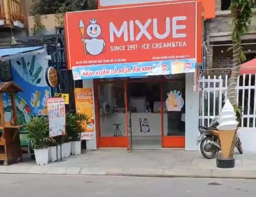 蜜雪冰城在越南延续着魔幻吸引力:一边循环播放主题洗脑神曲,一边有雪王玩偶摇头蹦迪,还有整齐划一的诺大红色招牌,在街头十分醒目。