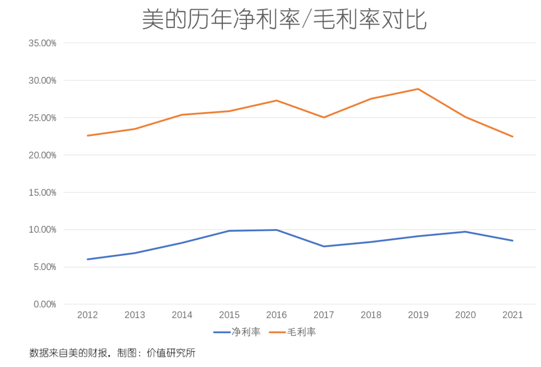 纵向对比就可以发现,美的的退步非常明显:2019和2020财年归母净利润同比分别增长了19.68%和12.44%。上一财年,美的毛利率和净利率分别为22.48%和8.5%,前者是2012年以来的最低水平,后者则是2015年以来的低谷——换句话说,美的的赚钱能力基本上相当于一夜回到十年前。