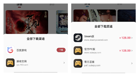 在赋予玩家自主性外,作为百度旗下的产品,咻咻星球也没浪费站在巨人肩膀上的优势。除了对百度贴吧内玩家社区的引流外,百度强大的搜索引擎功能,也为咻咻星球提供了资源跨平台调动的技术支持,是其游戏库多元内容的保障。在游戏的下载方式中,除了提供了以百度账号为主的渠道服外,还有官方下载路径,这一点上与TapTap类似。此外,玩家可从软件中直接进入游戏官网以及Steam等平台进行付费游戏的购买,而不会被打断行为,为玩家“发现游戏—下载游戏”提供了一条畅通无阻的道路。