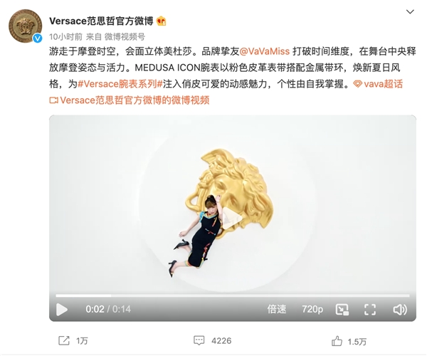 5月19日,意大利时尚奢侈品牌VERSACE范思哲官宣签约VaVa毛衍七(D.M.G)。“游走于摩登时空,会面立体美杜莎。品牌挚友VaVa毛衍七打破时间维度,在舞台中央释放摩登姿态与活力……”官方同时还发布了一支时尚简约、高级感十足的新品腕表广告片,在如时间流动般的旋律节奏中,骨子里自带音乐基因的VaVa毛衍七由内而外灵动演绎品牌/产品内在精神与态度。