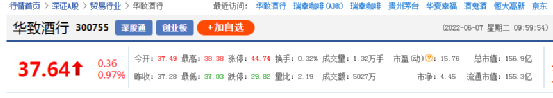 正是依靠茅台和五粮液等知名白酒品牌的加持,上市3年来,华致酒行的股价由发行价16.79元/股,一路飙升至如今的37.64元/股,股价增幅为124%,总市值达到157亿元(截至2022年6月7日10时)。