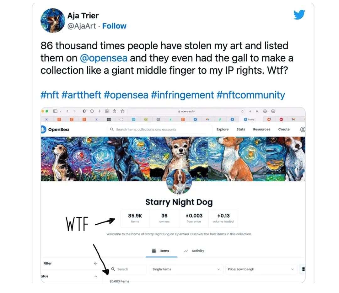 荷兰艺术家Lois van Baarle在Opensea上搜索她的名字时发现有100多件她的艺术品正在出售,而没有一件是由她自己铸造;美国艺术家Aja Trier在她自己从未进行任何NFT操作情况下,在OpenSea上发现了接近9万个以她的IP作品为基础创建的NFT。