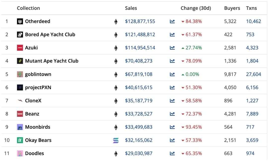 根据分析网站cryptoslam.io过去 30 天的 NFT 销售统计数据显示,自上个月以来,NFT 的总体销售额下降了 65.43%,从上个月的46 亿美元下降至15.9 亿美元,几乎所有项目的销售情况都出现了断崖式下跌。