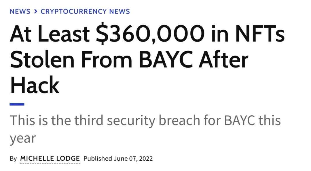比如就在两天前,无聊猿(BAYC)NFT就再次遭到网络钓鱼攻击,损失价值超过40万美元,而这已经是该项目近2个月来发生了第三次安全漏洞攻击。4月底,无聊猿的官方Instagram账户才刚被盗,并通过欺诈链接盗取了价值280万美元的NFT,此前周杰伦价值42万美元的无聊猿NFT也是在这种钓鱼攻击下不翼而飞。