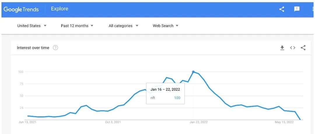 根据Google Trend的搜索数据显示,最近“NFT”的搜索热度已经从去年七月的高峰下降到了2021年1月之前的水平,侧面反映出人们对于NFT的关注热度正在急剧下降。