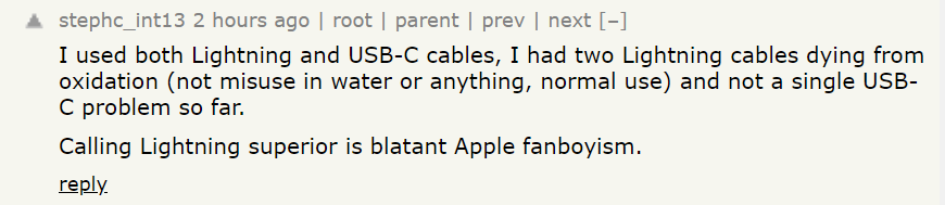 我同时使用了Lightning和USB-C充电线,我的两条Lightning充电线都因为氧化而没法使用了(不是因为进水了或者其他的,是正常使用),而到目前为止没有一个USB-C充电线出现问题。所以说Lightning更优越的明显是果粉。