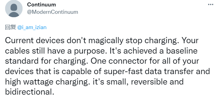 目前的设备仍然需要充电。你的充电线仍然有用。它实现了充电的基线标准。一个连接器适用于你所有的设备,能够实现超快的数据传输和高瓦特的充电。而且它体积小、可逆、双向。