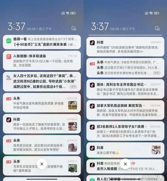最后,今日头条、爱奇艺极速版、抖音、抖音极速版、百度极速版,则成为了这次广告推送测试中的“魁首”。可以看到,这几款应用都推送了大量的通知信息,有的是诱导性的广告、有的是新闻,还有些则是“热门”视频类的推荐。