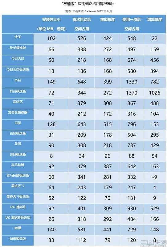但新的问题也就此产生了,安装包体积小有时候并不见得意味着安装后所占用的存储空间就小。况且现在这些应用本身在使用的过程中,都还会下载各种各样的内容缓存(当然,也包括各种广告信息),所以即便一开始看起来更“省空间”的“极速版”应用,在使用一段时间后说不定是反而比原版还更加臃肿。