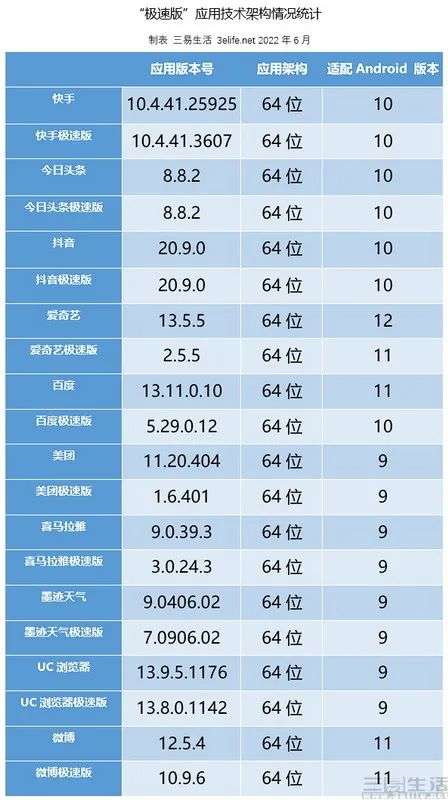 可以看到,从应用架构上来说,目前这20款应用无论“极速版”还是原版,均已适配了64位的移动处理器,而这显然是令人欣慰的。