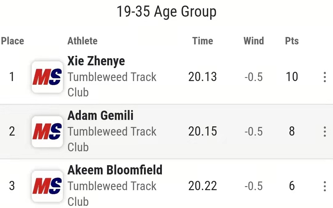 谢震业参加的比赛在佛罗里达州一所学校举行。在逆风0.5米/秒的状况下,谢震业以20秒13的成绩率先冲线。