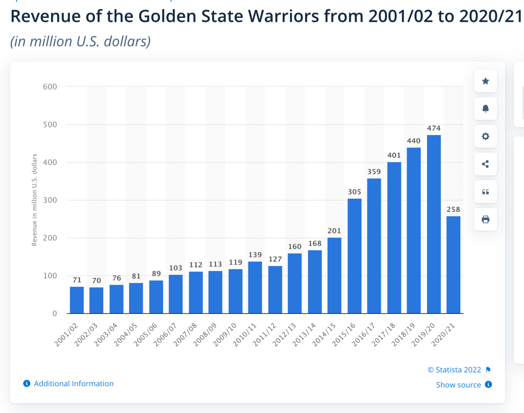 勇士队2001-02赛季至2020-21赛季收入一览数据来源:Statista