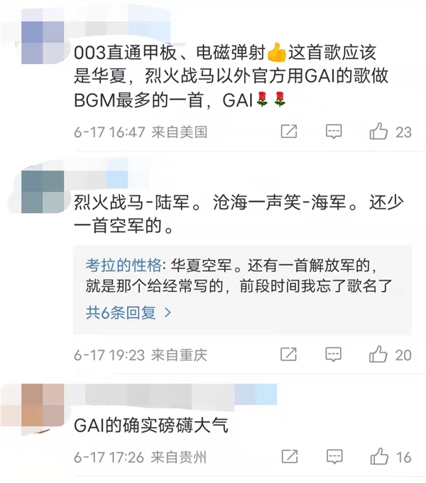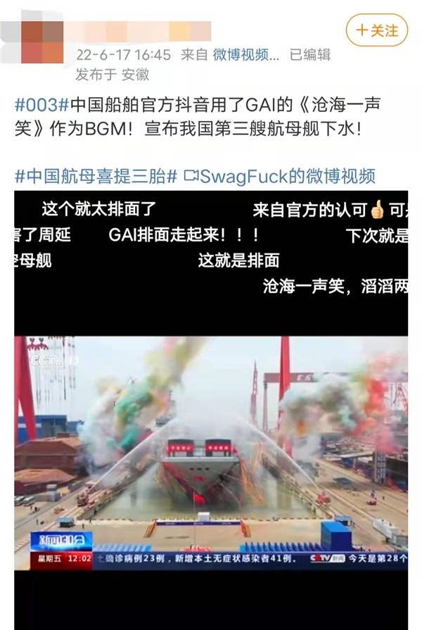 不久前,谷爱凌夺冠,赛场响起GAI周延演唱的这版《沧海一声笑》;近期,亚洲首位UFC世界冠军张伟丽出场曲及获胜曲再次使用《沧海一声笑》作为BGM;6月17日,举国瞩目的我国第三艘航空母舰举行下水命名仪式,中国船舶官方抖音号发布的视频画面搭配GAI周延演唱的《沧海一声笑》,“沧海一声笑,滔滔两岸潮,浮沉随浪记今朝”大气磅礴的歌声一出,振奋人心。