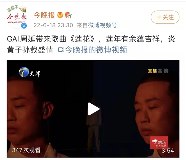 直播现场,GAI周延以两首潮流中国风说唱歌曲《莲花》《华夏》燃炸全场,将晚会的气氛推向高潮。在《我是唱作人》的舞台GAI周延首次演唱了由他创作的《莲花》,将他自己真实的人生经历与感悟写入歌中,每每听来总是带给人无穷的力量,QQ音乐歌迷如是评价“在GAI哥的音乐里我总能找到对生活对人生的百般热情,谢谢GAI哥的每一次用心的歌给了我前进的动力”。天津《今晚报》媒体报道“GAI周延带来歌曲《莲花》,莲年有余蕴吉祥,炎黄子孙载盛情。”