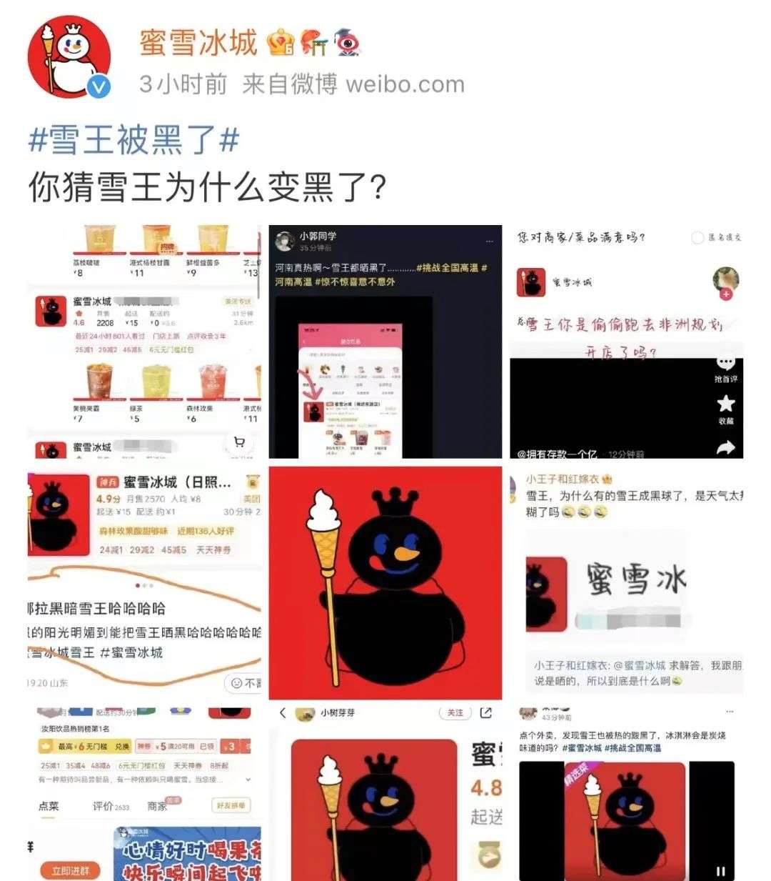 这不,近日有网友反映,蜜雪冰城的“雪王”也耐不住40多度的高温,白色“雪王图标”也晒黑成了“黑雪王”,相关微博话题蜜雪冰城晒黑了#的词条也迅速登上热搜。