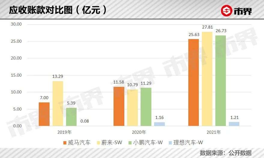 除此之外,一个值得关注的数据是,威马汽车的收入规模虽然不及别人的1/4,但2021年末应收账款却毫不示弱,达到了25.63亿元,与蔚来和小鹏相当。