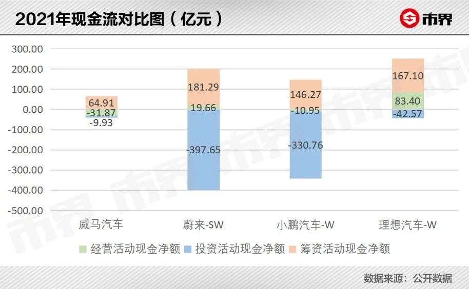 从整体的现金流情况来看,2021年威马汽车是四家中经营活动现金净流出最多的——说明主业仍在大把花钱,而别人已经开始逐渐赚钱,或只是小亏。