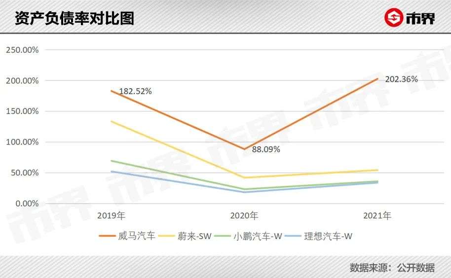 横向对比四家造车新势力(以下简称“新势力四小龙”),2021年末威马汽车的资产负债率已达到惊人的202.36%,远超出另外三家的30%-55%,意味着威马汽车每1元的资产伴随的都是2元以上的负债。