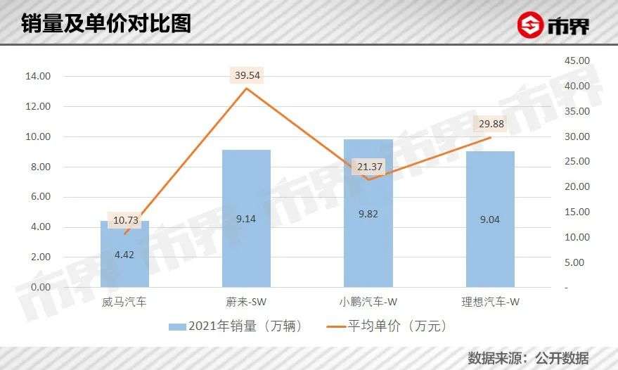 威马汽车一度试图通过发力网约车市场,抢占短期内收效更明显的To B市场,从而忽略了细水长流的To C生意,2021年10.73万元的平均单价远低于另外三家。