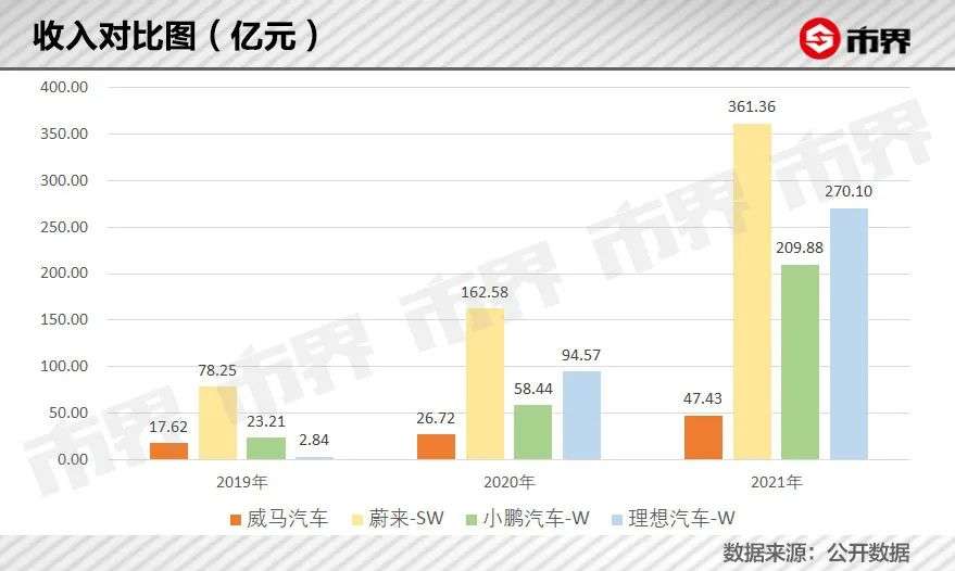 王兴并未回应沈晖的喊话,而后来的威马汽车也显然没能完成赌约,与另外三家的收入差距还被进一步放大。2021年收入不到50亿元的威马汽车,别说和“蔚小理”比肩了,现在看来连“比腰”都有困难。