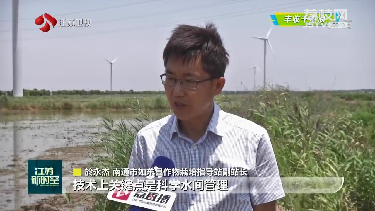 江苏台记者胡於棋说:“我现在所在的地方是南通市如东县栟茶镇方凌垦区耐盐水稻示范种植基地。刚收完了小麦和油菜,村民们又忙着夏种。他们正在将耐盐水稻秧苗移载到我身旁稻田里。”