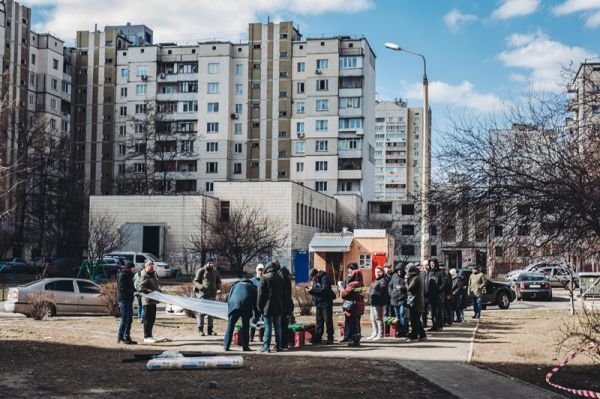 资料图片:2022年3月17日,人们在乌克兰基辅领取用来遮挡窗户的塑料布(彩色通稿)
