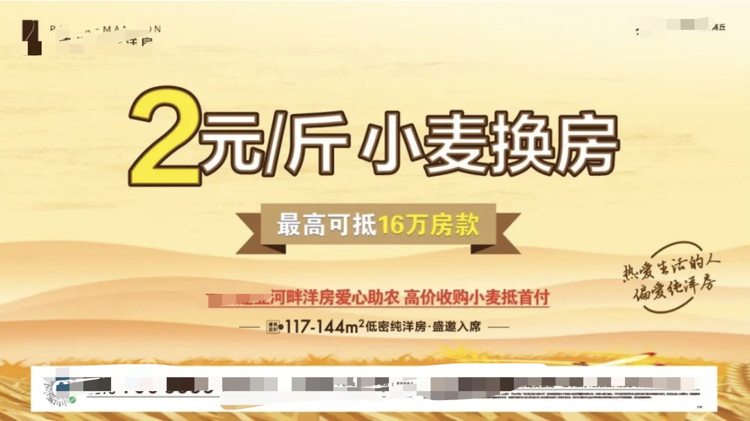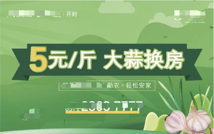 6月20日,“爱心助农、高价收购小麦抵首付”、“爱心帮扶,助力安家”的销售海报突然火了,建业集团在河南商丘市民权县的建业河畔洋房宣布小麦2元/斤,最高可抵16万元房款;开封市杞县的建业城,则打出了“大蒜5元/斤换房,16天成交86万斤大蒜”的促销广告。