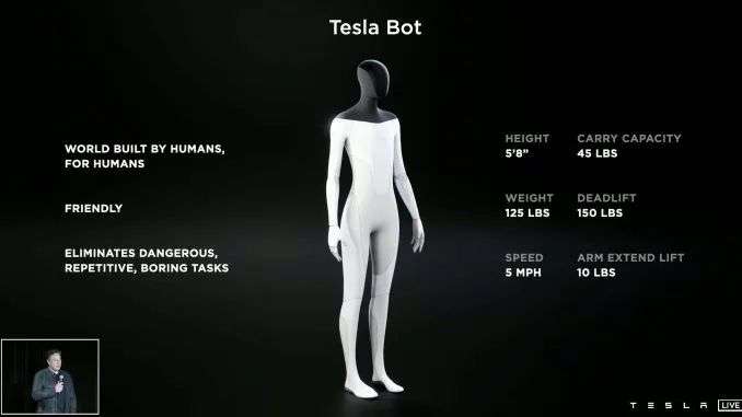 根据此前披露的信息,该款机器人名为“擎天柱”,又被称为“特斯拉人形机器人(Tesla Bot)”,将基于特斯拉自动驾驶电动车所使用的芯片和传感器。 根据最初面世时的介绍,“擎天柱”身高为5尺8寸(约1.73米),重125磅(约56公斤),行走速度为每小时5英里(约时速8公里),最多可提45磅(约20公斤)的物品;头部会配有一块屏幕,以便使用者获取有用的信息。