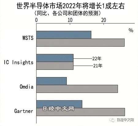 在其他调查公司,乐观的预测也显得突出。美国IC Insights于6月公布了对2022年市场的预测,认为将比上年增长11%,增至6807亿美元,维持了截至1月的预期不变。英国Omdia把此前定为4%左右的增长率预期上调为9%,美国IDC也于6月预测2022年将增长14%。