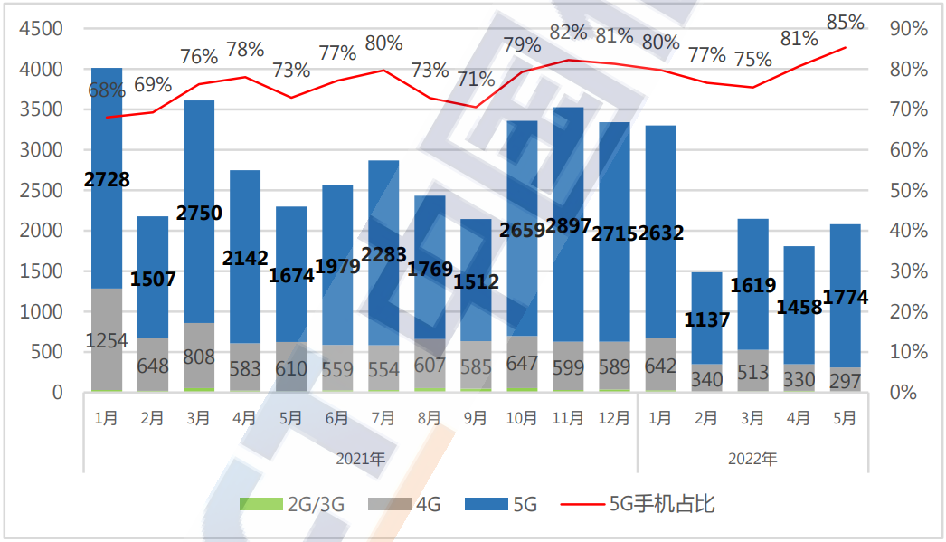报告显示,5月国内市场手机出货量2080.5万部,同比下降9.4%;其中5G手机1773.9万部,同比增长6.0%,占同期手机出货量的85.3%。智能手机出货量2055.9万部,同比下降9.1%,占同期手机出货量的98.8%。