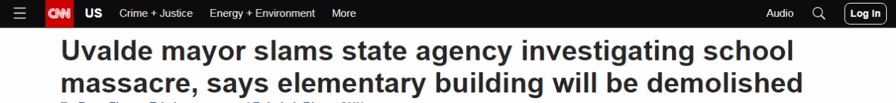 上个月,得克萨斯州尤瓦尔迪市罗布小学发生震惊全美的枪击案,一名18岁枪手杀害21人,其中19人是孩子。综合美国有线电视新闻网(CNN)和路透社报道,尤瓦尔迪市市长麦克罗克林当地时间21日表示,该小学将被拆除。他还严厉批评负责调查枪击事件的得州公共安全部主管“撒谎”和“误传信息”,称自己厌倦了对已发现的证据一无所知。