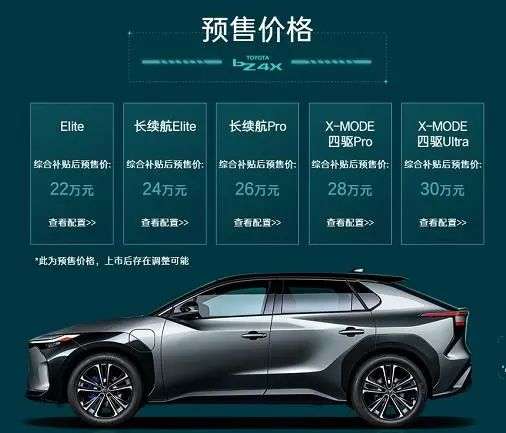 目前,bZ4X的预售价格是22~30万元,续航里程400~615公里,属于中规中矩。市界在某国内知名汽车搜索平台,将价格调至该区间发现,其竞品包括北汽新能源的极狐阿尔法、比亚迪的唐新能源、广汽埃安的AION LX与V、大众的ID系列、奥迪Q2与Q4e-tron,以及红旗E-HS3等共计29款车型。