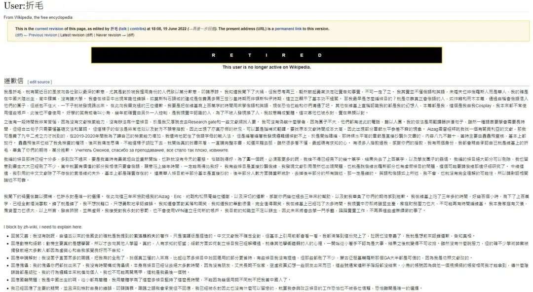 这个叫做折毛的维基用户最终承认了编撰词条的行为。她表示自己一开始确实是想要认真学习历史的,但在第一次造假后, 为了圆第一个谎,就只能撒更多的谎。假的维基内容也从几万字延伸到了百万字,当你付出的越多,也就越难舍弃它。