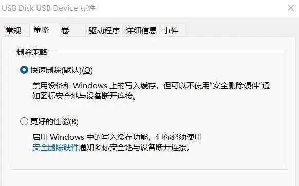 为此,微软推出了「更好的性能」模式,并设为默认设置,根据 Windows 官方的支持文档,该模式可以将操作缓存到外部设备提升传输速度。