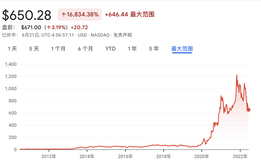 6月21日,特斯拉美股股价下跌至650.28美元/股(折合人民币约4354.7元/股),而特斯拉美股股价最高曾达到1222.09美元(折合人民币约8184.3元/股)。并且在过去的半年内,特斯拉美股股价一直在动态下降。