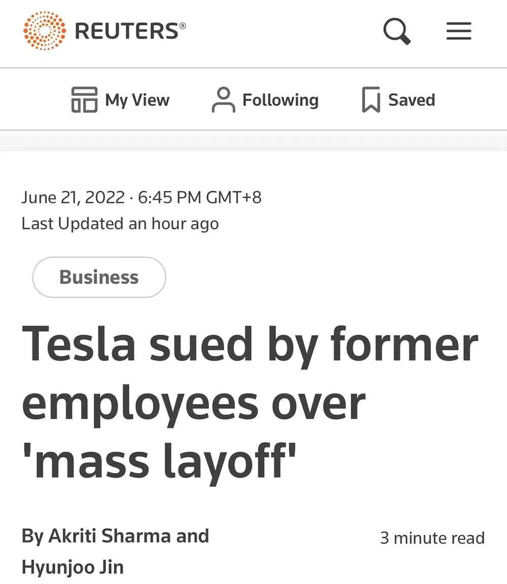 ▲路透社报道特斯拉被裁员工诉讼