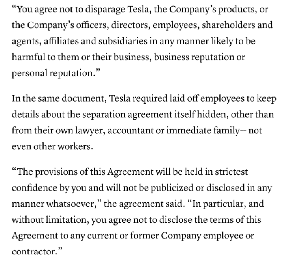 不过推特用户BoldProgressices.org也透露,特斯拉国外被裁员工已经和特斯拉签署保密协议,保证离职后不攻击公司、公司产品及同事,否则需要赔偿,所以那些员工在领英上的帖子都显得特别友善。疑似特斯拉中国区被裁员工或许也签署了类似的协议。