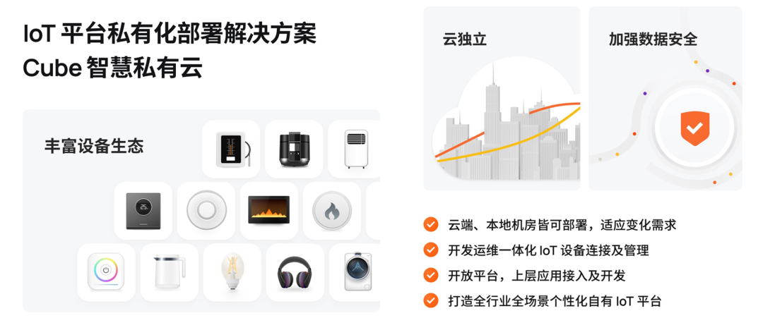 今年初正式发布的Cube智慧私有云则是一个云独立的IoT平台私有化部署解决方案。通过Cube智慧私有云,开发人员可以在客户自有的云服务器上构建一个处理各种设备连接和管理、App与SaaS开发和数据分析的可扩展大型私有IoT平台。
