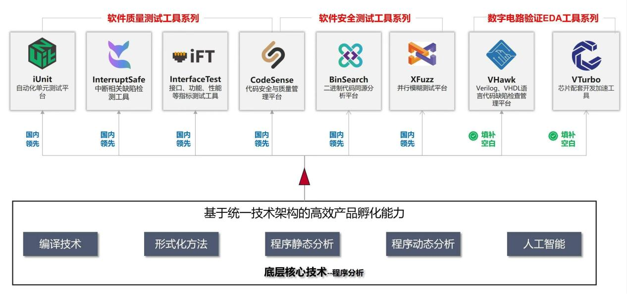 针对上述痛点,依托于国防科大、清华大学以及中科院等高校以及华为、Synopsys等行业内人才的技术和产业化背景,近年来,泛联新安自主研发了软件质量测试、软件安全测试和数字电路验证(EDA)三大类10余款产品。其中,软件质量测试工具主要解决现有工具自动化程度不高、测试用例覆盖率偏低,以及不适应国产软硬件平台等问题。软件安全测试工具主要解决安全检测规则覆盖不全、准确率不高、对规模化代码无法深度分析等问题。数字电路验证工具主要集中在数字电路前端验证领域,解决国产平台适配和自主发展的问题,特别针对了高端点工具突破的问题。