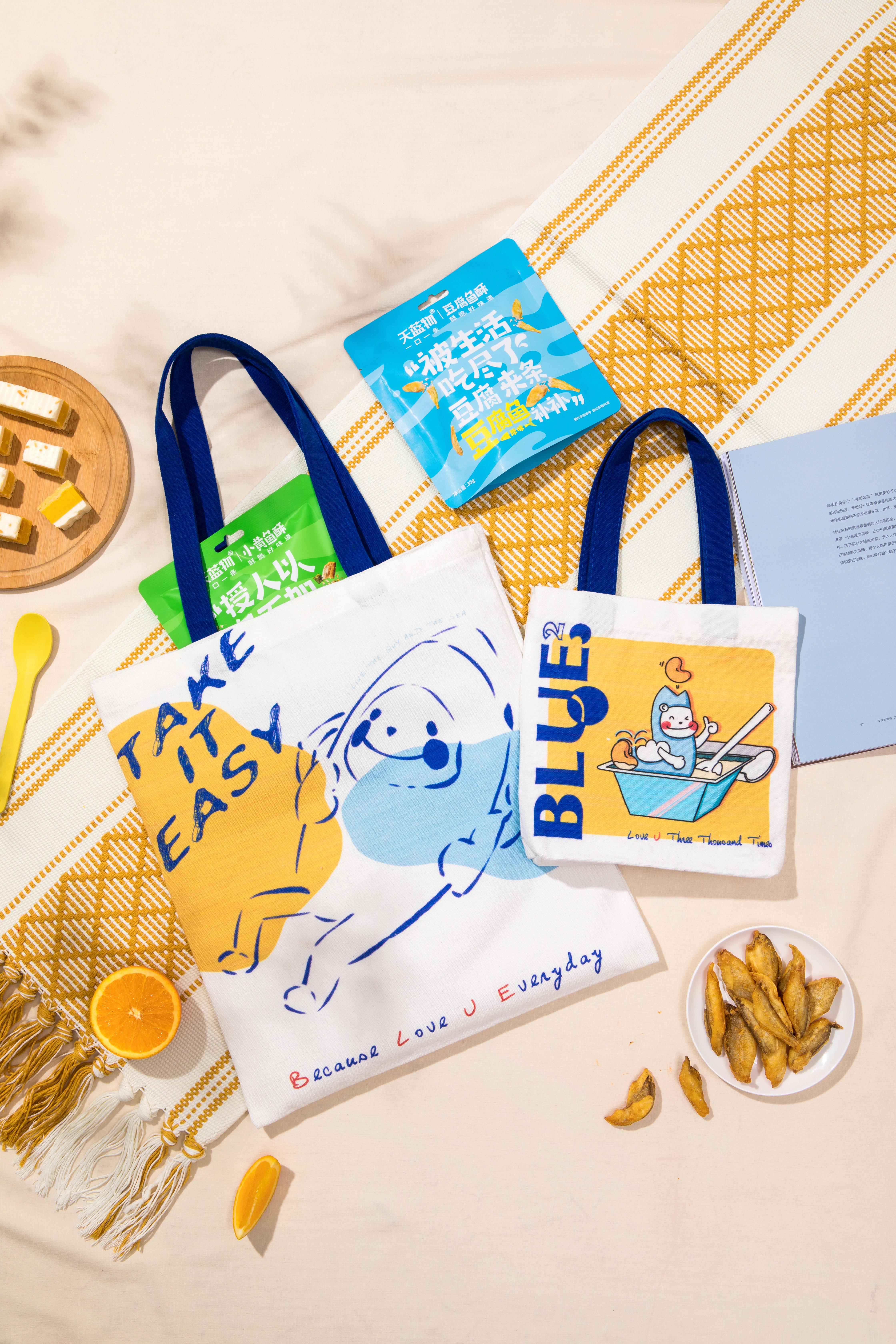 “Because Love U Eeveryday”,是「天蓝物」的英文商标—— BLUE,而“blue”的发音很像鱼吐泡泡的声音。「天蓝物」想要成为带给消费者欢乐和爱的零食品牌,正如“躺平”款帆布袋上写着的 “take it easy”一样,希望每个人在高压环境下都能保持平和的心态。
