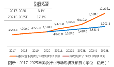 根据36氪研究院预测分析,传统业态下的国货美妆行业将稳步发展并在2025年达到6204亿元的市场规模,然而在科技赋能下,市场规模将会迎来新一轮爆发,预计在同年能达到1万亿元左右。随着国潮文化的兴起,国货品牌已不再是国际大牌的“平替”,不再依赖单一性价比优势抢占市场,开始更多地把注意力都放在产品研发上,同时,也不断加强智能科技的研发与应用。然而,突破口,在哪里呢?