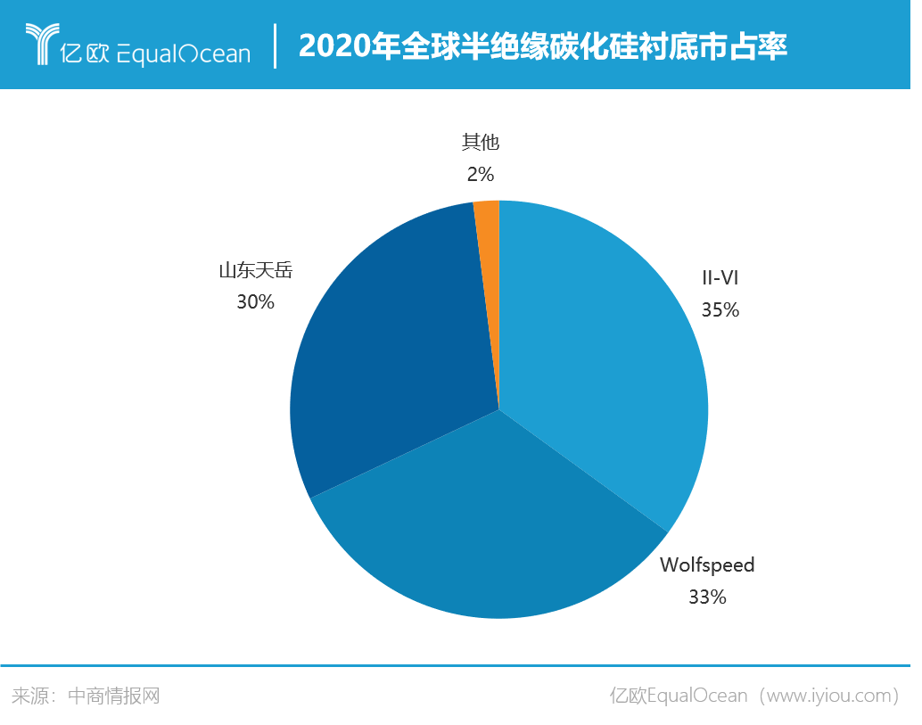 据统计,在半绝缘型碳化硅衬底方面,2020年全球半绝缘型碳化硅衬底市场集中度较高,美国的Wolfspeed、II-IV以及国内山东天岳三家独大,占比合计高达98%。