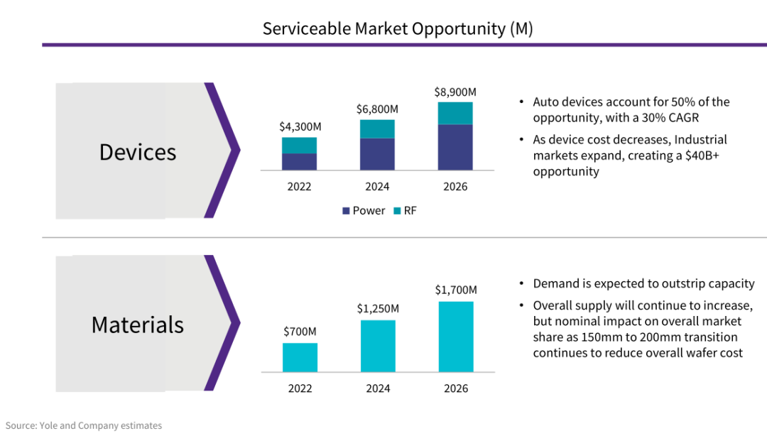 据TrendForce,全球碳化硅、氮化镓功率半导体市场预计2022年将达到18.4亿美元,2025年会进一步增长到52.9亿美元。Yole发布的Power SiC 2022报告更预测到2027年,碳化硅器件市场将超过70亿美元,比2021年的10亿美元增加60亿美元。Wolfspeed援引Yole数据则预估2026年,仅碳化硅材料领域市场空间就有17亿美元。